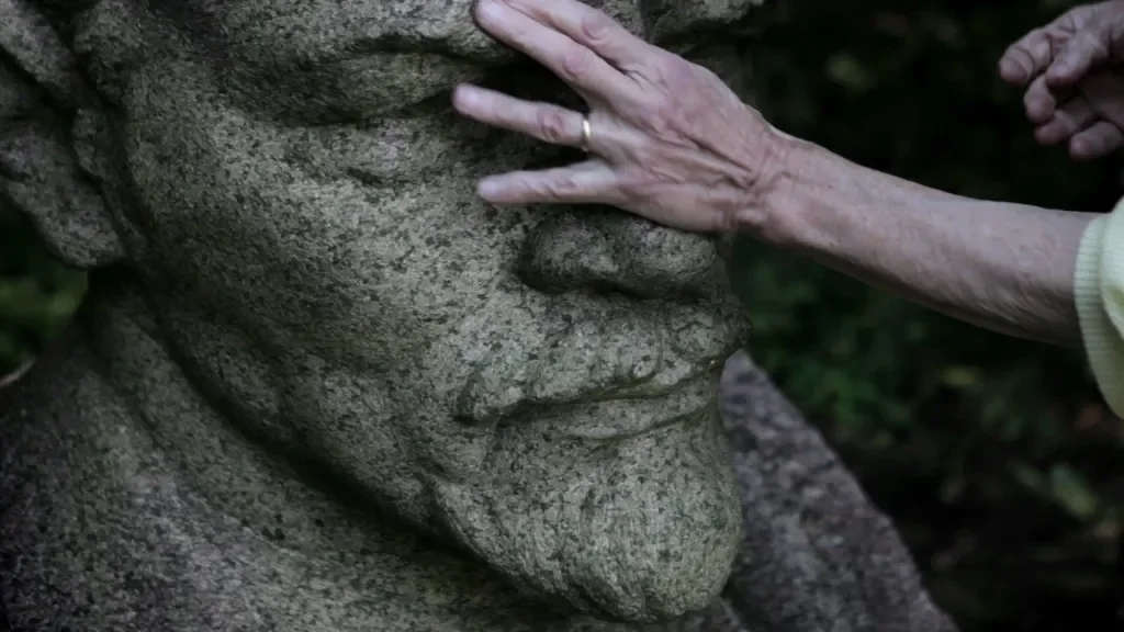 The camera quietly observes Aldona as she moves through Grūtas Park in southern Lithuania, a sculpture garden filled with statues removed from public spaces after the dissolution of the Soviet Union in 1991. Guided by memory and touch, Aldona feels the monumental sculptures with her hands . In one of the film’s most poignant moments, she reaches out to the towering figure of Stalin, sensing history through contact rather than sight. Shot on 16 mm film, its grain and texture evoke both intimacy and distance, linking the fragility of the image to that of the body it portrays.